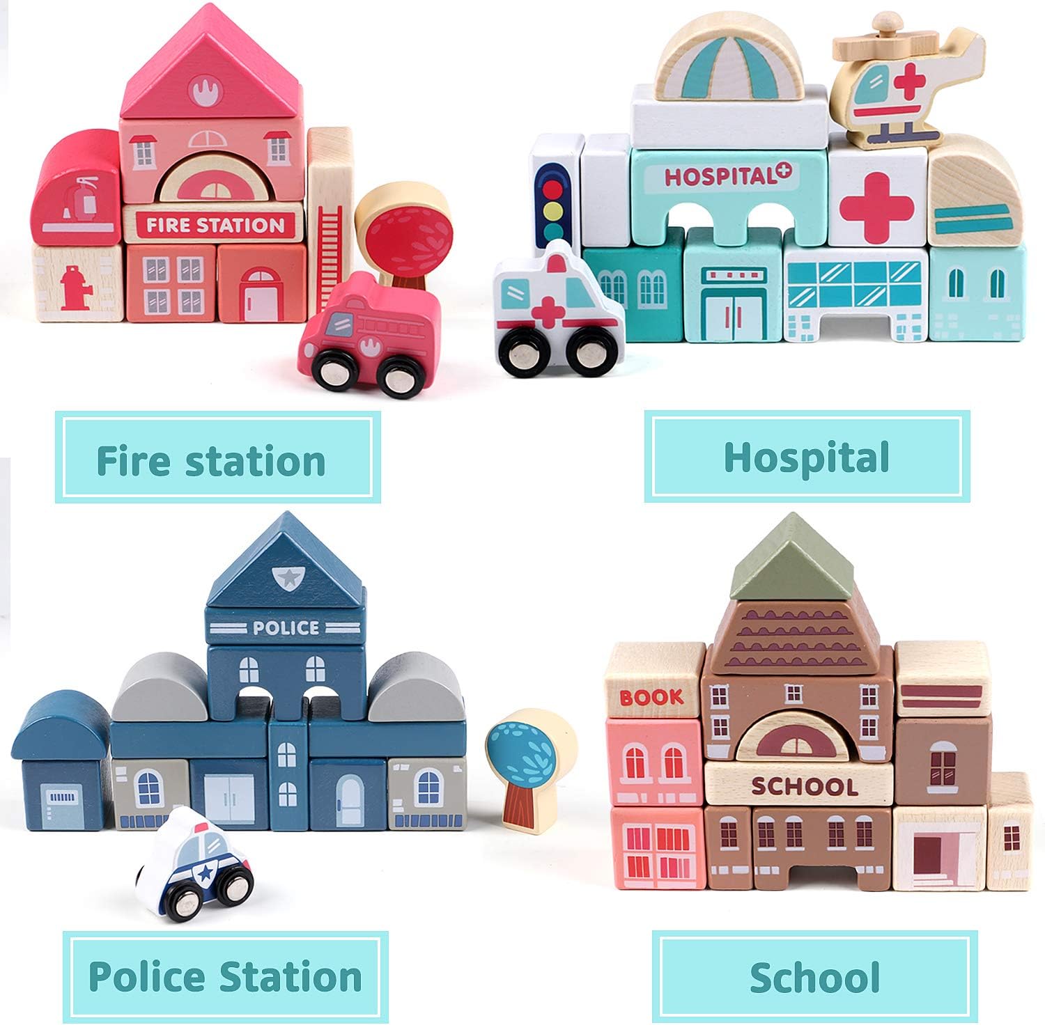 - Pretend play city toy: Share this fun toy with your friends at the party. Construction Building blocks Set helps children build a perfect city. Pretend to be sitting in one of the cars to visit and travel in the city. Passing school, arrive at the ice cream shop, eat ice cream, then go to the supermarket, and then return to the hotel to rest. A great toy for kids to play for hours.