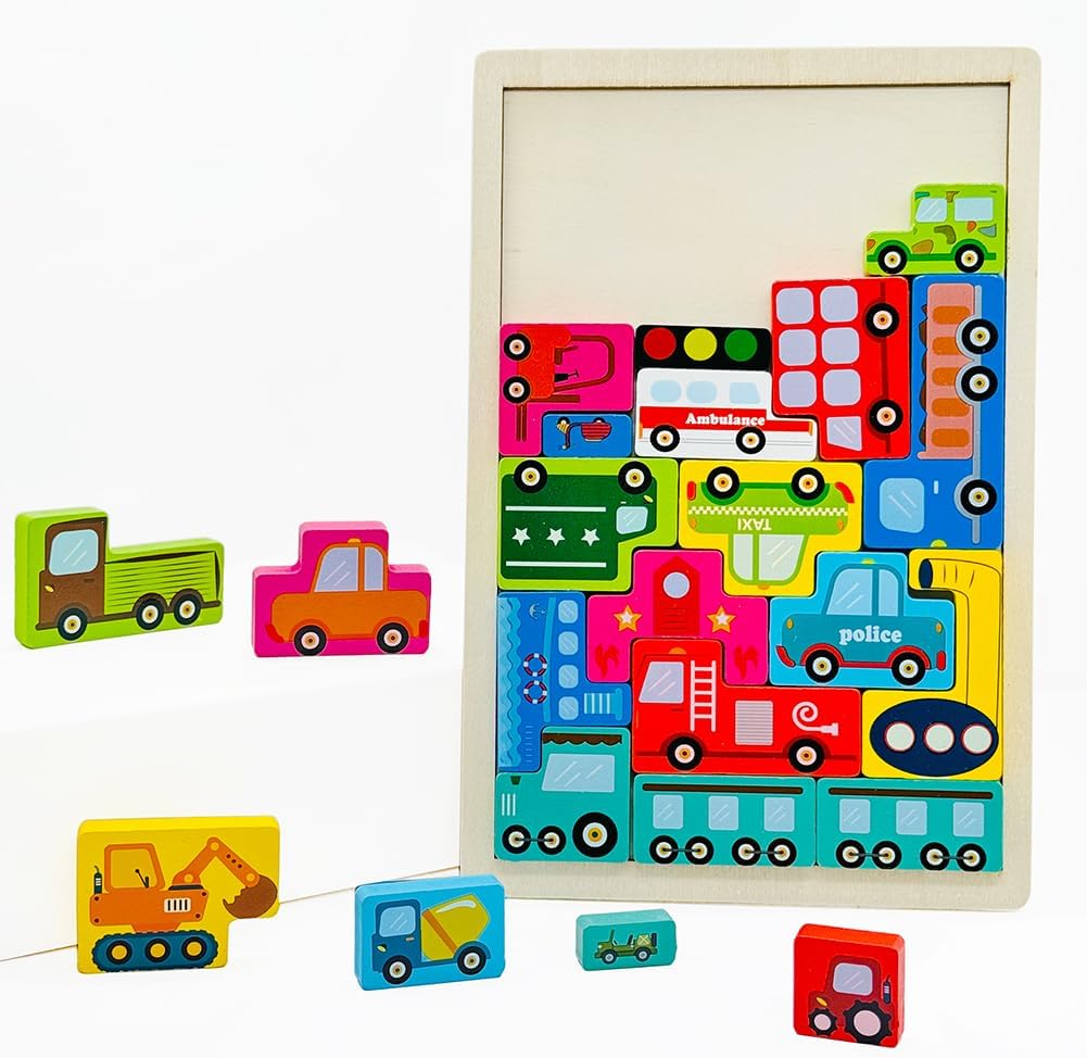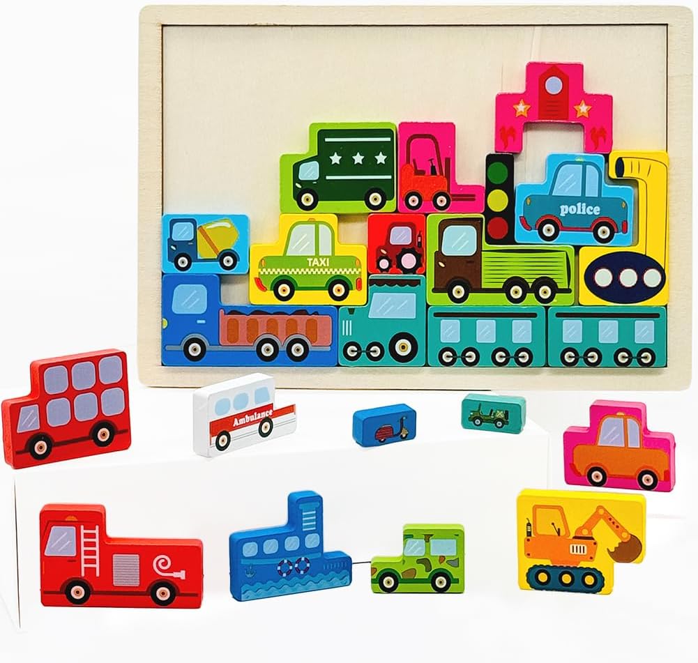Wooden Blocks Puzzle Russian Blocks for Kids Age 3 4 5 Years Old, Children’s Puzzle Game Board Learning Education Montessori Toddler Puzzle Wooden Toys for Kids Birthday Party Gift (Vehicle)